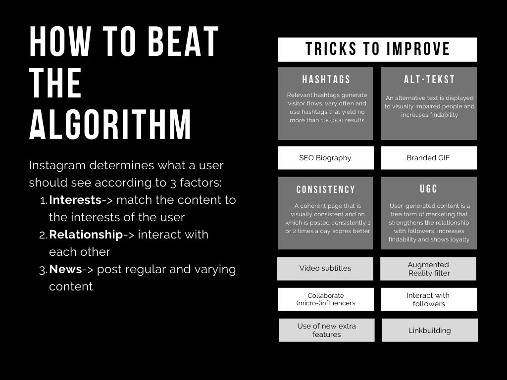 Tijdens het ontwikkelen van een contentstrategie heb ik veel geleerd over het algoritme van Instagram. Alle tips die ik heb gevonden, heb ik overzichtelijk weergegeven in deze afbeelding. Op deze manier kon ik mijn bevindingen inzichtelijk maken voor de medewerkers die met de contentstrategie aan de slag moesten.